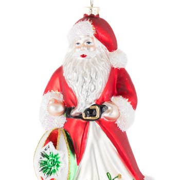 Santa riding the New York's Subway glass ornament Santa riding the New York's Subway Christmas ornament 4" long 1 3/8" wide 5" tall. A glorious Santa Clause is taking a short cut to manage to delier all the present, riding on a New York City # 2 Subway car. The adorable Santa has ditched his reindeers drawn sliegh which like any other vehicle got stuck in traffic in New York City overcrowded street, and to avoid all the traffic jam, took a hint from some of the daing New York City youth and hopped atop a Subway car, to hasten his gift delivery in the super crowded streets. Dressed in traditional red clothing, shiny black boots, a flowing golden gown with the Subway map on it, holding for dear life his big brown bag bulging with presents, and a golden lamp to lit the dark Subway tunnels. The New York Subway was inagurated in 1904 and isworld famous, it is an object of love/hate in the city. One can't move efficiently without it, but the travel itself can leave a lot to b desired.