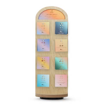 Made in Toronto, Canada Size: 14.5" x 7.5" The Monogram Collection Display comes with 24 earring sets (1 of each style in Gold and Silver) plus a FREE wood incline slotted display and backer card for merchandising. These earrings and necklaces are handmade from lead-free fine pewter and plated in 14 karat gold or silver. Each on a colourful card, these mix & match earring sets feature a crystal cushion stud earring, a capital letter stud, and a beautiful stud with chain. The perfect earring stack for everyday style.