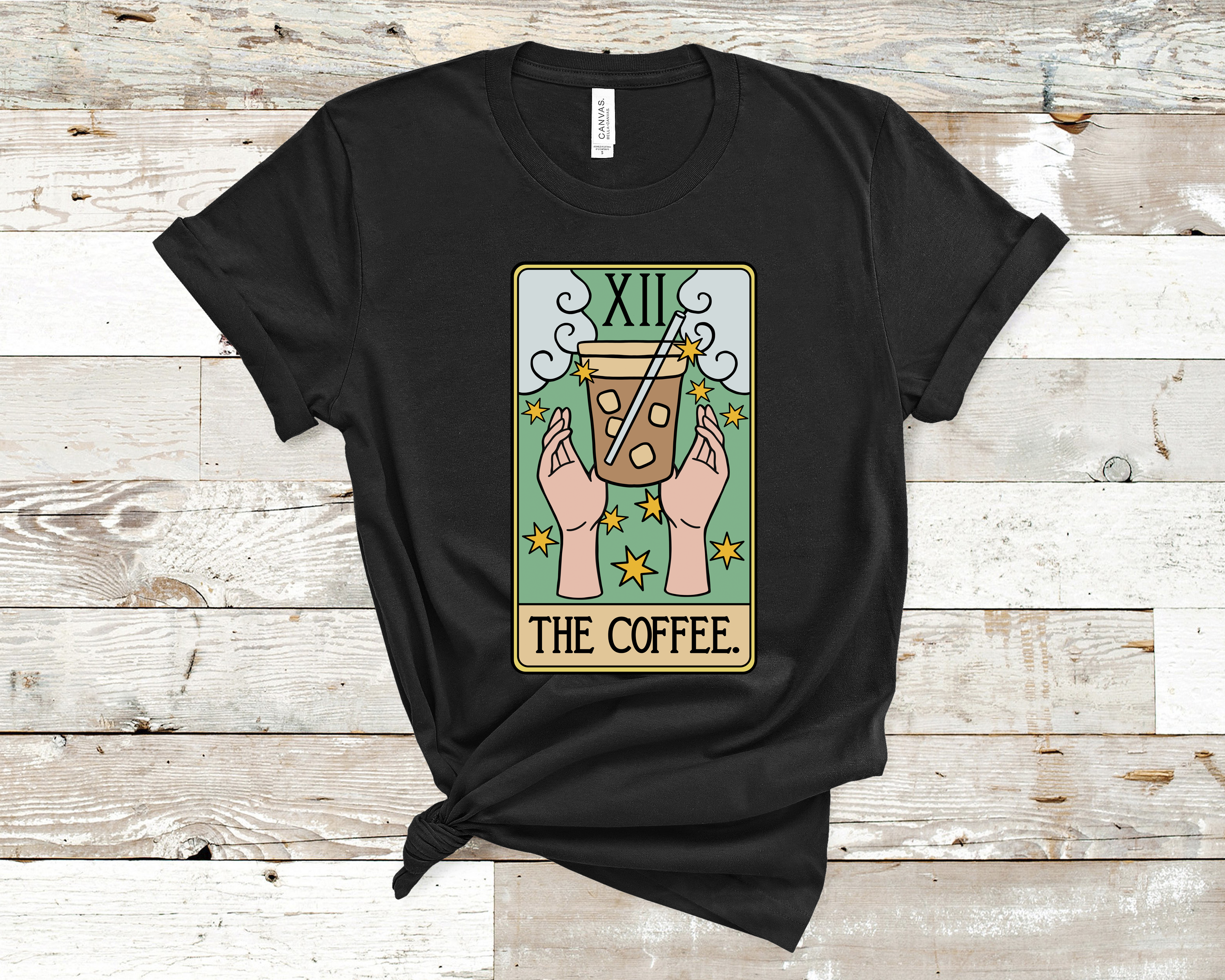 It is by caffeine alone I set my mind in motion It is by the beans of Java, that my thoughts acquire speed The hands acquire shakes; the shakes become a warning It is by caffeine alone I set my mind in motion. Front Print Black T-Shirt Pre-Shrunk 100% Cotton Ringspun shirt Made in USA Artist: Scott Merritt ©Pegasus Publishing. All Rights Reserved.