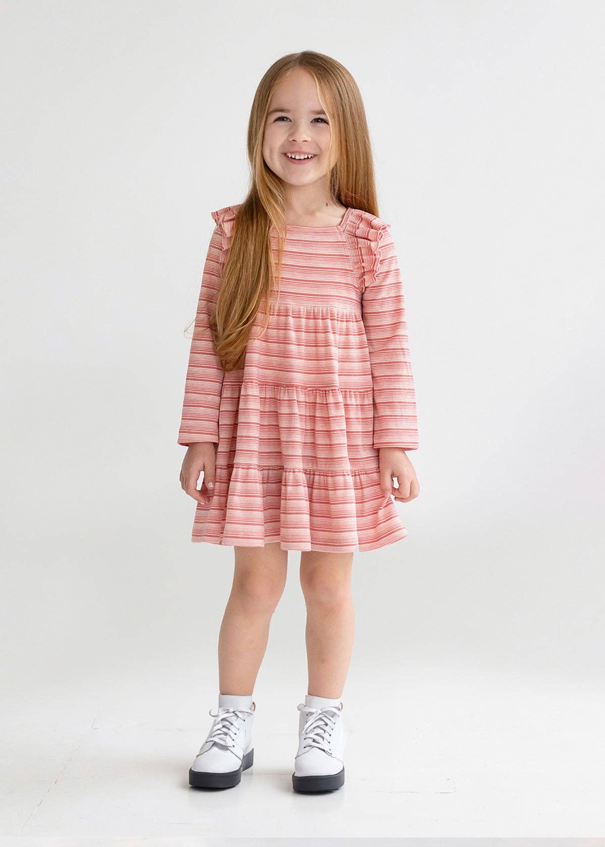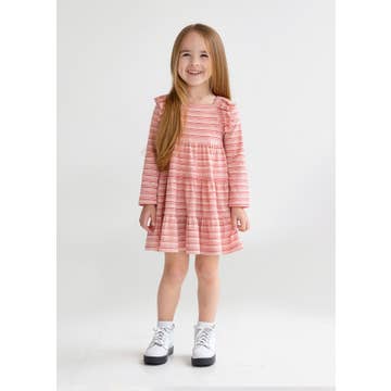 Our bestselling long sleeve twirl dress is a must-have addition to any little girl's wardrobe. Crafted from high quality knit fabric, this dress is gentle on skin, ensuring a comfortable fit and easy wear. Functional pockets make it practical, and a sweet bow accent on the back adds the perfect girly touch! The jewel-toned stripe pattern is perfect for fall. Pairs well with Periwinkle Blue, Very Berry, Pink. Care Instructions: Machine wash cold; only non-chlorine bleach when needed; tumble dry low Fabric Content: 95% Cotton, 5% Spandex Reference Code: G4266
