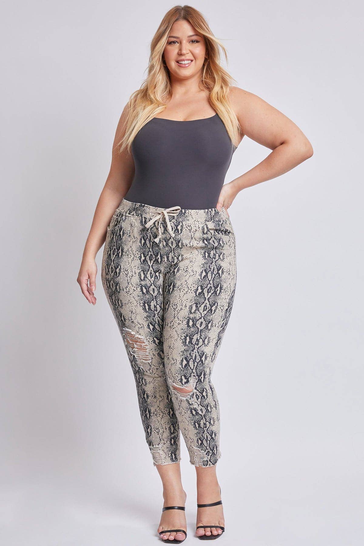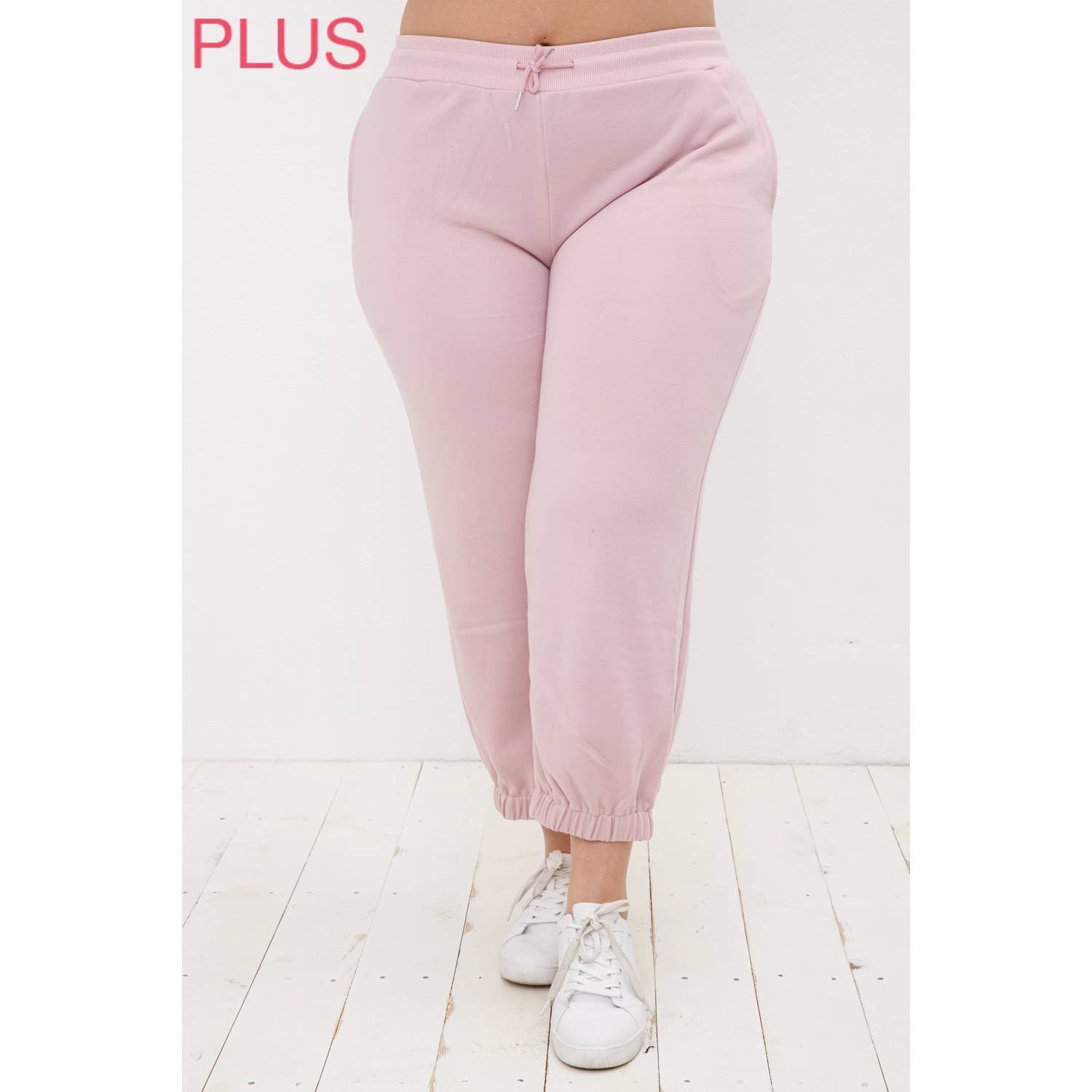 Our Women's Plus Size High-Rise Ankle Joggers are an incredible staple to add to your closet! Featuring front tie, elastic waistband, light distressing, and frayed hem. This garment moves with you throughout the day for a comfortable, flexible fit. Measurement (Based on size 2X) - Inseam: 27” - Rise (To top edge of band): 12.5” - Leg Opening: 13” Composition For Color 872LM: - 98% Cotton/ 2% Spandex • Machine wash cold. • Model is wearing a size 1X for color 872LM.