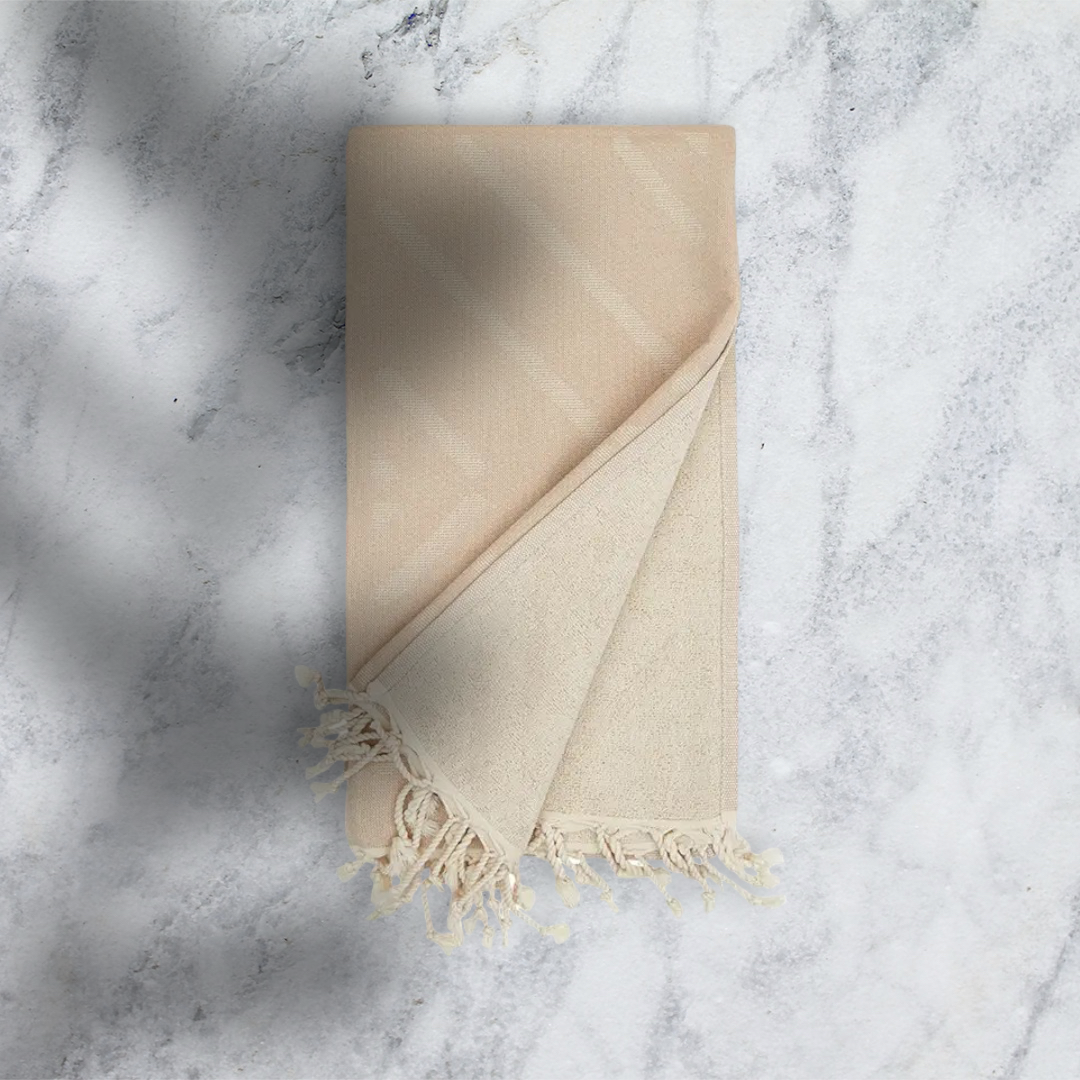 A slow-woven towel featuring a classic herringbone detail set against a beige chevron background. Made with organic cotton. The beautiful Flax Line Organics collection was designed and created with an artisan's touch. Each towel features two sides stitched together with care - a smooth cotton gauze front and a terry pile back made from 100% organic cotton. Their compact design makes these towels highly absorbent, quick to dry, and incredibly comfortable for travel or daily use. With a classic herringbone accent and subtle color palette, this bestselling collection effortlessly blends elegance and function. Materials: Cotton gauze front, 100% organic cotton pile backing Dimensions: Washcloth (S): 13.2" L x 13.2" W Hand Towel (M): 33.5" L x 13.2" W Care: Machine wash with cold water and mild detergent. Avoid bleach or fabric softeners. Hang or tumble dry on low.  Made in: Imabari, Japan