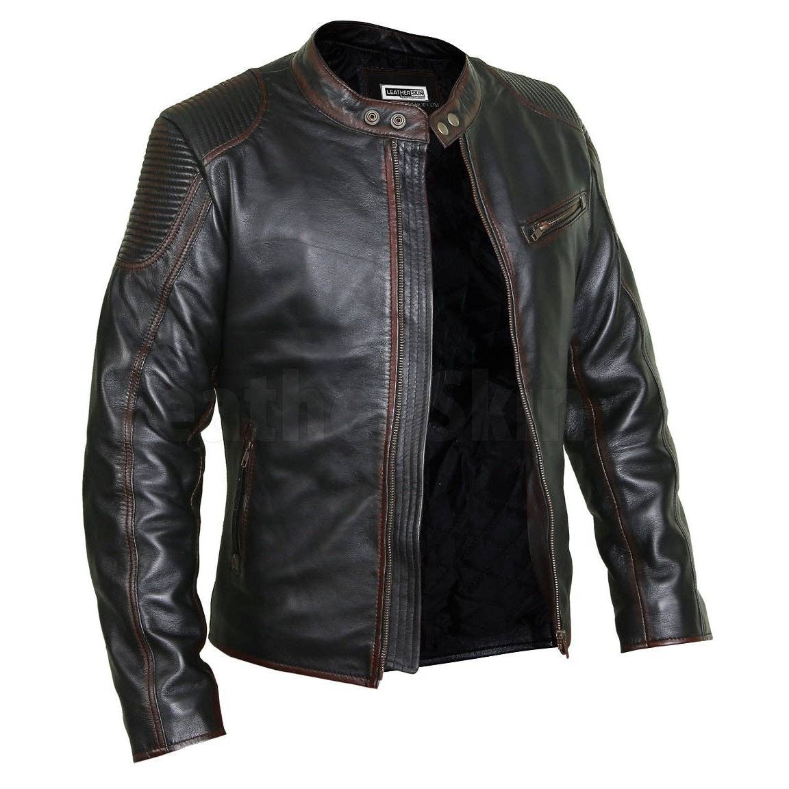 Handcrafted from premium, eco-friendly sheep leather. Café racer jacket with straight YKK front zipper and stand-up collar with snap button closure. 2 chest and 2 side zip pockets. A sleek men’s leather jacket combining timeless style with sustainable craftsmanship. Free Customization Available: 1) Choice of material: Premium sheep or cowhide 2) Lining options: Quilted, satin, or synthetic fur 3) Extended sizing: XS to 4XL, plus full custom fits 4) Private labeling (MOQ required) 5) Custom stitching, pockets, and detailing 6) Wide color range 7) Custom closures, buttons, or YKK zippers