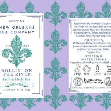 Caffeine-Free Herbal Tea Country of Origin: USA / Chile / Thailand / South Africa / Egypt / Poland / China Region: Washington State / Patagonia / Petchabun / Cederberg / Nile River Delta + Fayoum / Gdansk / Fujian Cup Characteristics: A herbal symphony with delicious mint notes and hints of peach and spice. Cleansing finish. Caffeine Content: None Infusion: Yellowish with green highlights and hints of reddish orange Ingredients: Peppermint + Spearmint leaves, Rosehip pieces, Ginger, Rooibos, Rose + Calendula + Sunflower + Osmanthus petals Step aboard the steamboat Natchez and let Rollin’ on the River take you on a journey of pure bliss. This herbal blend is a symphony of minty goodness, with hints of peach and spice to keep your taste buds tantalized. And just like the mighty Mississippi, this tea has a memorable finish that will leave you feeling refreshed and renewed.