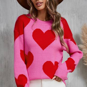 Eye-catching heart checkerboard pattern, perfect for a playful and stylish look. Available in vibrant dual-tone options including classic Red/Pink and chic all-Pink. Crafted from soft, comfortable knit fabric, ideal for cozy everyday wear. Designed with a relaxed fit to provide comfort and a flattering silhouette. Versatile sweater that easily pairs with jeans for casual outings or special occasions like Valentine's Day.
