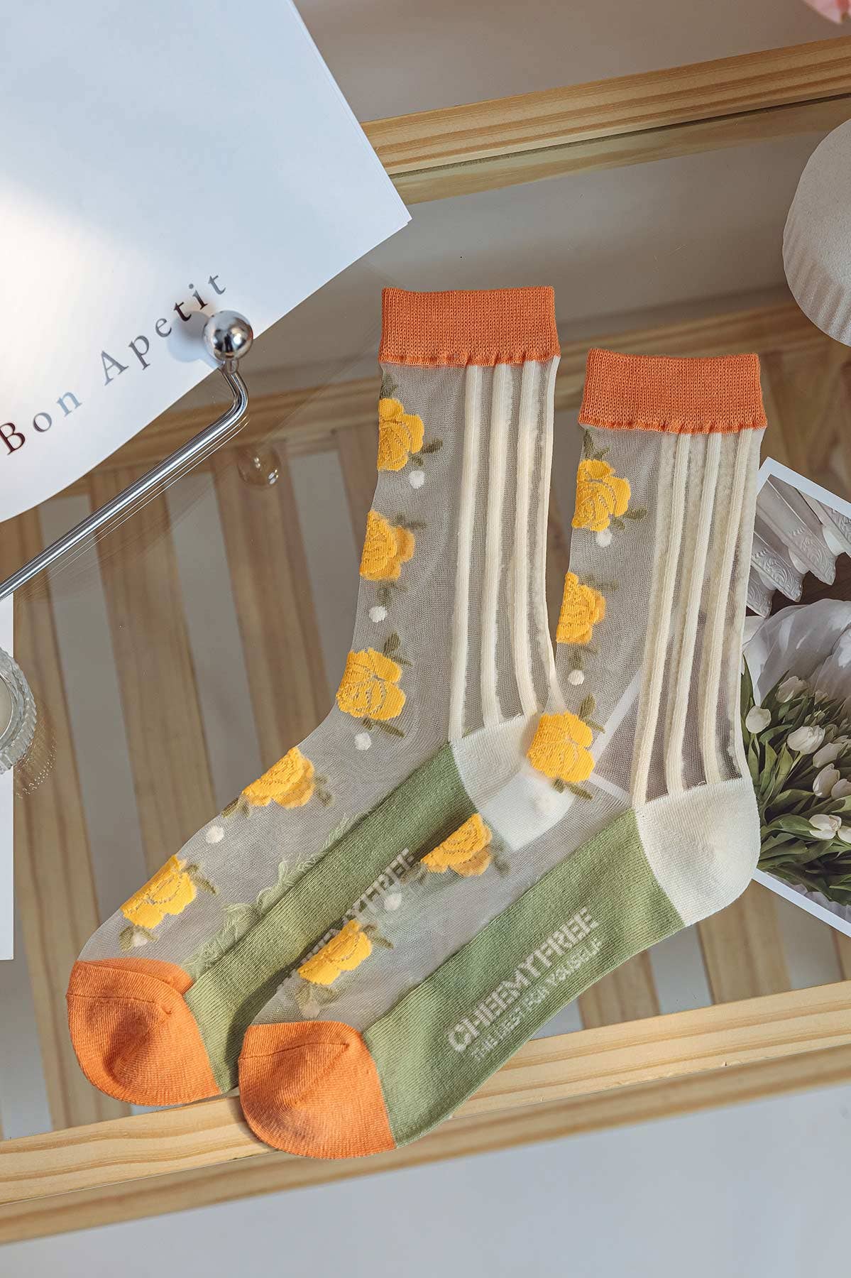 Exquisite transparent stocking socks with embossed floral embroidery, designed to enhance your style with a romantic and sophisticated touch. The lace detail on the cuff makes them even more special and delicate. ✅ High-quality embossed floral embroidery 🌼 ✅ Cuff decorated with wavy lace 💫 ✅ Lightweight, fresh, and comfortable fabric 🌿 ✅ Perfect for a romantic and chic look 👗 64.5% Nylon, 28.8% Polyester, 6.7% Spandex 64.5% Nylon, 28.8% Polyester, 6.7% Elastane 64.5% Nylon, 28.8% Polyester, 6.7% Elastane 64.5% Nylon, 28.8% Polyester, 6.7% Elastane 64.5% Nylon, 28.8% Polyester, 6.7% Elastane 64.5% Nylon, 28.8% Polyester, 6.7% Elastane