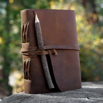 A genuine leather bound 100 page journal with very rustic, handmade, natural paper. The leather tie-off closure can also be used to secure the included rustic branch pencil or other preferred writing tool. Perfectly useable as a journal or sketch book and particularly well suited to any historical or costume needs. Dimensions: 8" length 6" width 1 1/2" depth