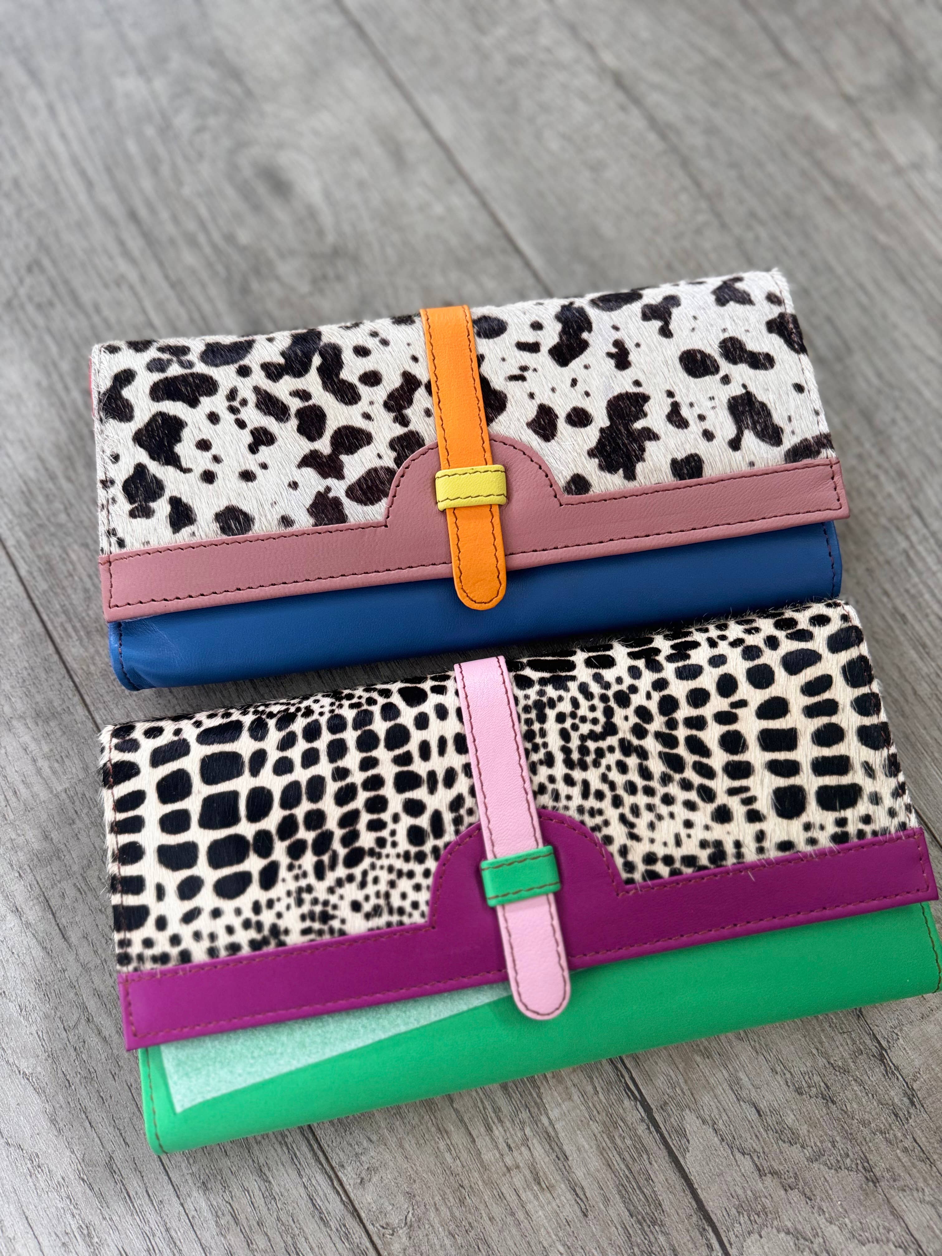 This wallet, made from recycled leather, features a bright-colored animal print that adds a bold touch to your style. Designed for practicality, it offers numerous pouches, pockets, and card slots to keep your essentials organized. Each wallet is one of a kind, ensuring that no two are exactly the same, so you’ll never have the same wallet as someone else. Eco-friendly and eye-catching, this wallet combines sustainability with vibrant fashion, making it a unique and functional accessory for everyday use.