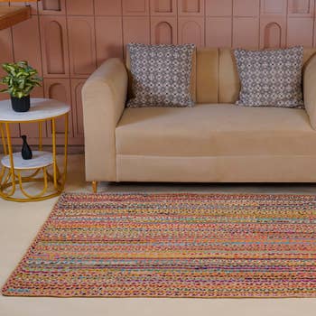 Handmade colorful chindi floor rag rug. This Indian chindi floor rag rug will add color and personality to any room with a well-chosen decorative rug This beautiful colorful chindi floor rag rug. can be used in bedrooms, living rooms, couches, benches or wherever you would like. Color: as picture Material: Recycled Cotton, Jute These rag rugs are made from fabric scraps, Jute and thread. Each piece unique and one of kind. You will get the similar product. Due to nature of fabric and handmade there are threads coming out. Color can be vary as item has photograph in sun light. We try our best to present the actual photo of the item but there can be differences in colors due to different monitor screen resolution
