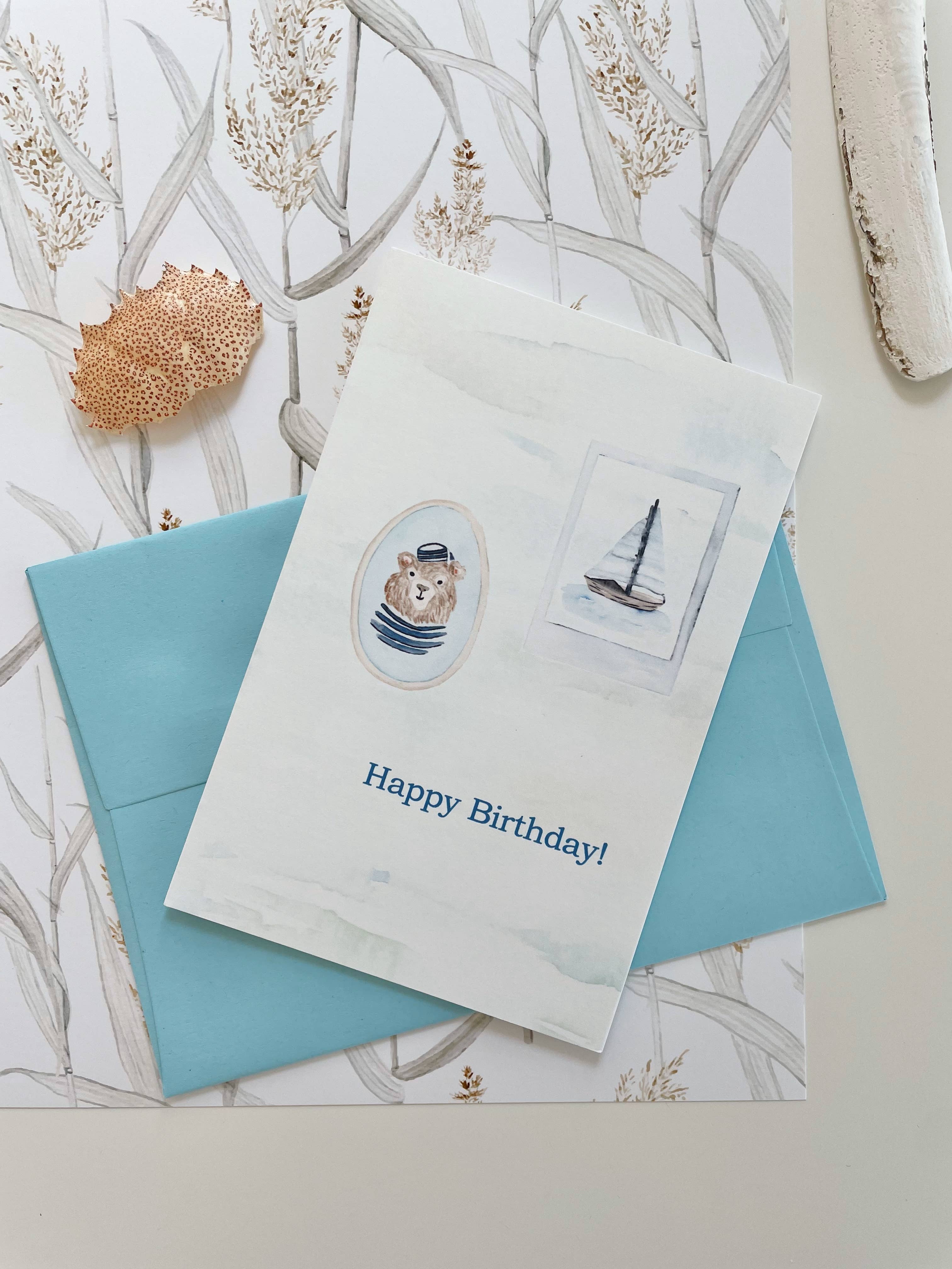 Happy Birthday Sailboat. This is the perfect nautical card to wish a happy birthday. All our cards are printed on SFI and FSC certified paper. Designed and printed in New England, USA. Beautiful bright white cover paper, blank inside, includes an envelope with peel & stick.