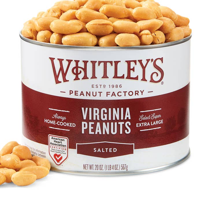 The famous "home-cooked" Virginia peanut! Crunchy, fresh and distinctive. One bite and you'll taste why these peanuts are our most popular selection. All of our nut products in vacuum sealed tins have a 10-12 month shelf life before opening. Gluten-free ingredients Serving size: 3 tbsp (30 g), Calories: 140, total fat (dv%): 10 g (13%), saturated fat (dv%): 2 g (11%), trans fat: 0g, cholesterol (dv%): 0 mg (0%), sodium (dv%): 80 mg (4%), total carbohydrate (dv%): 6 g (2%), dietary fiber (dv%): 3 g (10%), total sugars: 1 g (includes 0 g added sugars (0%)), protein: 8 g, vitamin d (dv%): 0 mcg (0%), calcium (dv%): 15 mg (2%), iron (dv%): 0.3 mg (2%), potassium (dv%): 190 mg (4%).