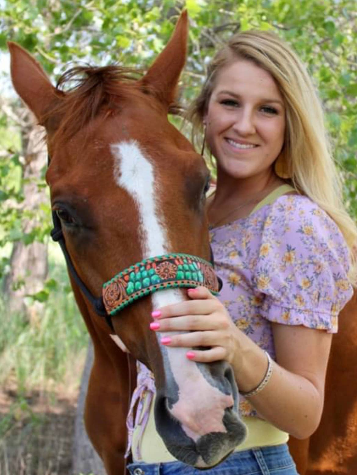 Beautiful medium oil headstall and breast collar set featuring inlay turquoise gator print hide, accented turquoise buck stitch, floral tooling and antique copper conchos with and silver buckles. Comes as a browband headstall and the one ear piece to swap out to which ever style you like best.