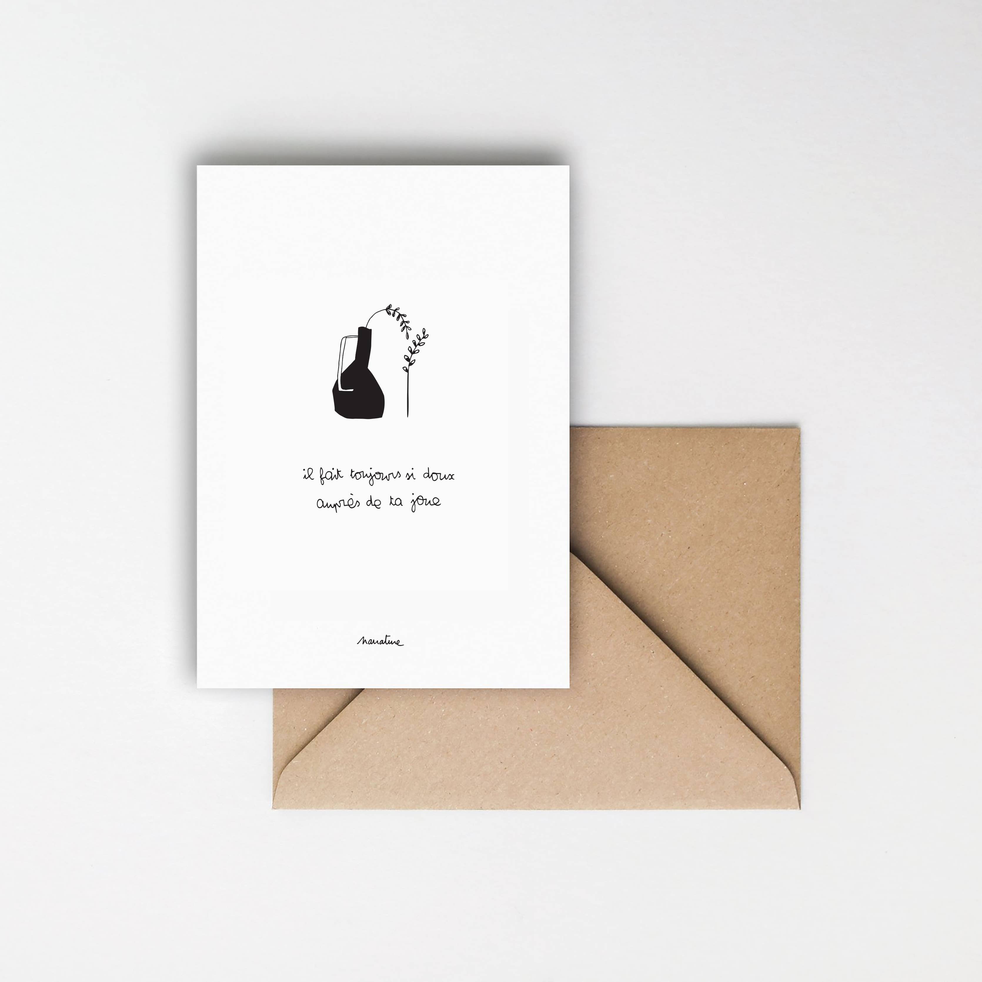 Card sold with a recycled kraft envelope in a transparent protective bag and with a brand explanation label. Handcrafted manufacturing and printing. > Handmade paper made from vegetable fibers of flax, hemp and cotton recycled by a passionate paper maker working in a mill in my region. The cards are then printed by me in my workshop in Corrèze. The paper is left raw and without lamination after printing at the mill. The poems and illustrations are thought out and drawn in my studio in Corrèze. Texts & illustrations: ©Narrature