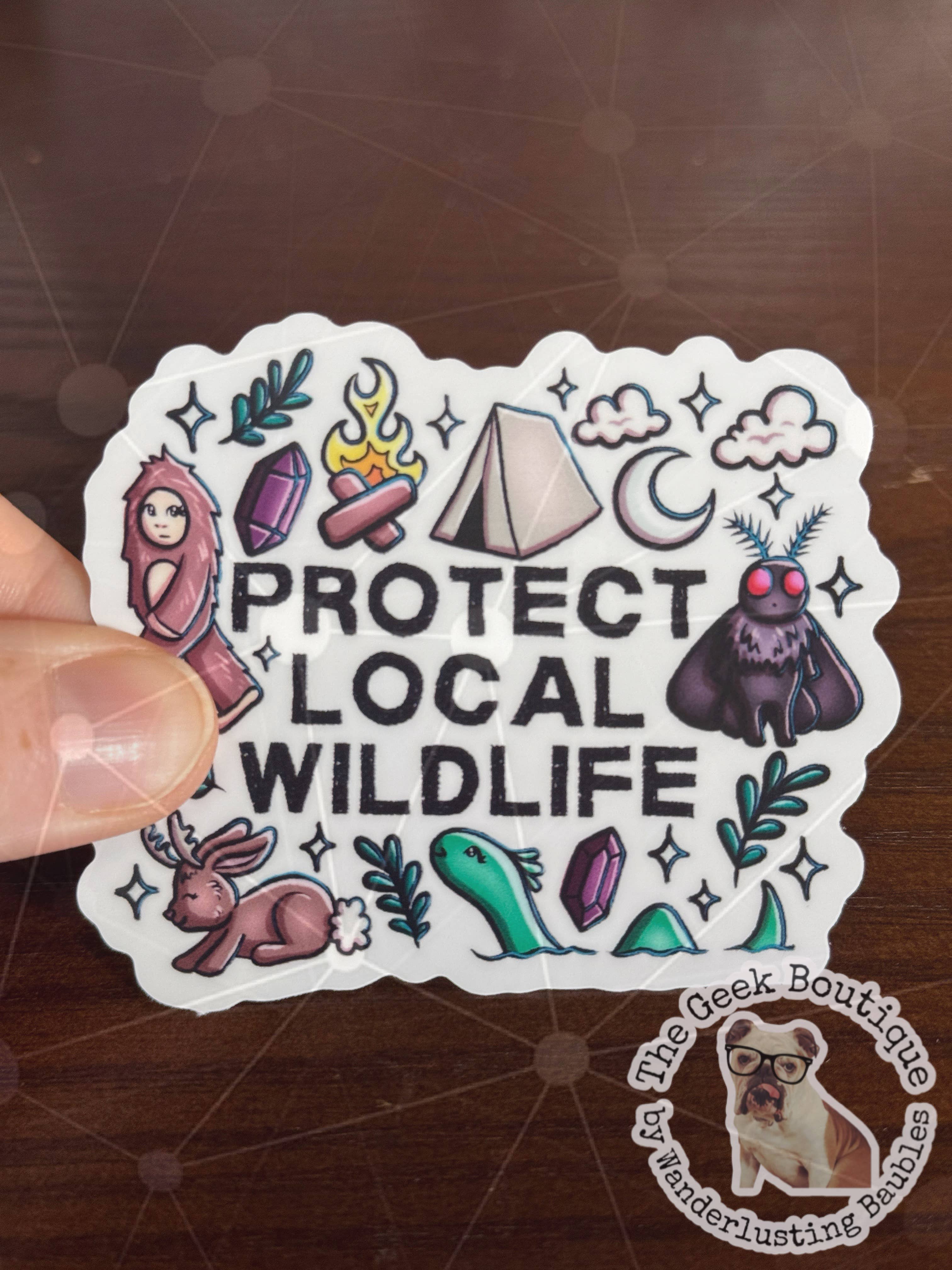 a leafy friend of the forest illustrated by ilikesara / Sara Schalliol-Hodge -measures 4.8" x 2.75" -printed on waterproof, UV-resistant vinyl -stick on your car, computer, water bottle, etc