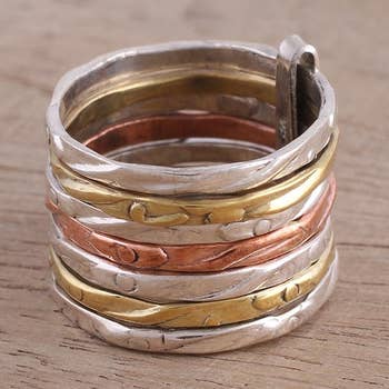 Spinning meditation ring “Breathe in…Breathe out…” Sterling silver with brass and copper Ring’s band is about 0.5 inches wide Available in sizes 6-10 This item may feature slight variations in details, finish, and overall appearance. Such characteristics enhance the unique beauty of each piece.