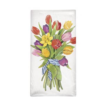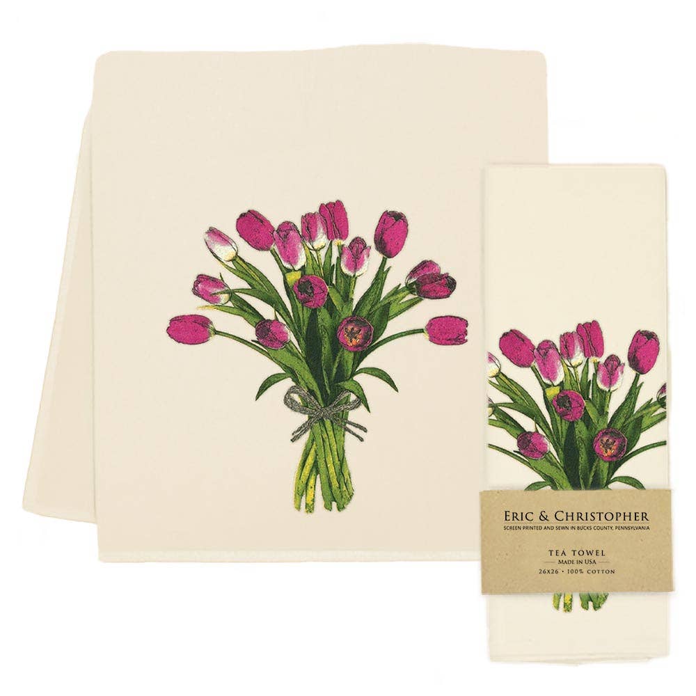 For the folks who loooove purple, our 'Textured Tulips' tea towel will not disappoint! Flowers featured are Lilac, Dream Touch Tulip, Parrot Tulip, Crunchy Cummins, and Fringed Blue Heron. Our tea towel design is UNIQUE because it is 2-sided! If you spill on one side, don't worry - just turn the towel around and the identical illustration can be displayed, stain-free! For casual luxury that brings sunshine to your kitchen, we offer soft and absorbent 100% cotton flour sack towels woven in India and printed in California. The towel is a classic 28-inch square featuring the illustration in the lower half. When folded, the display area of 14” x 9”. Our tea towels are machine washable, gentle cycle, no bleach. Because they are 100% cotton and not synthetic, the colors may fade over time, but the towel will still be gorgeous.