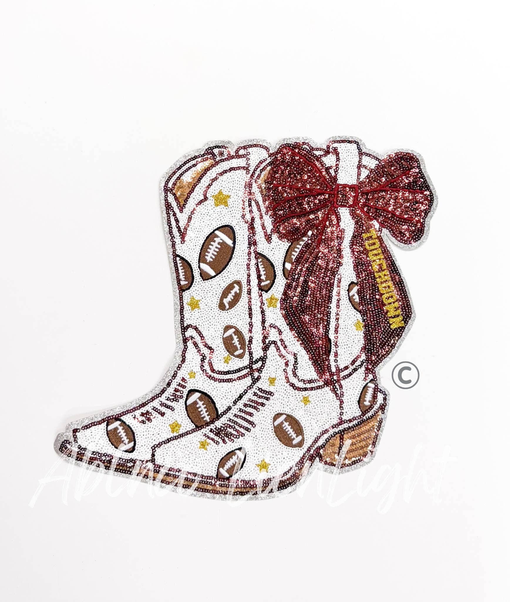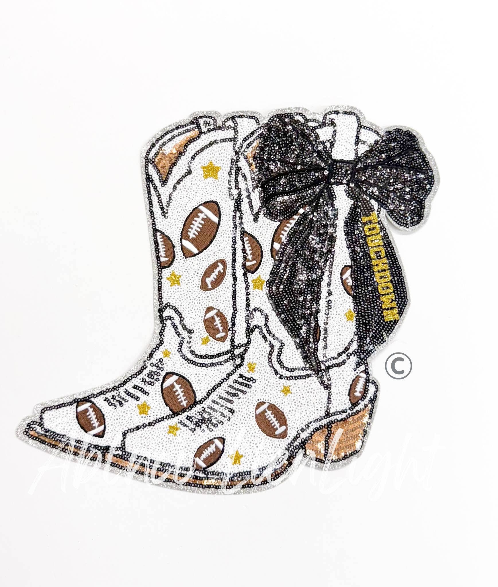 No reviews for Football Touchdown Purple Bow Boot Sequin Patch - Large yet.