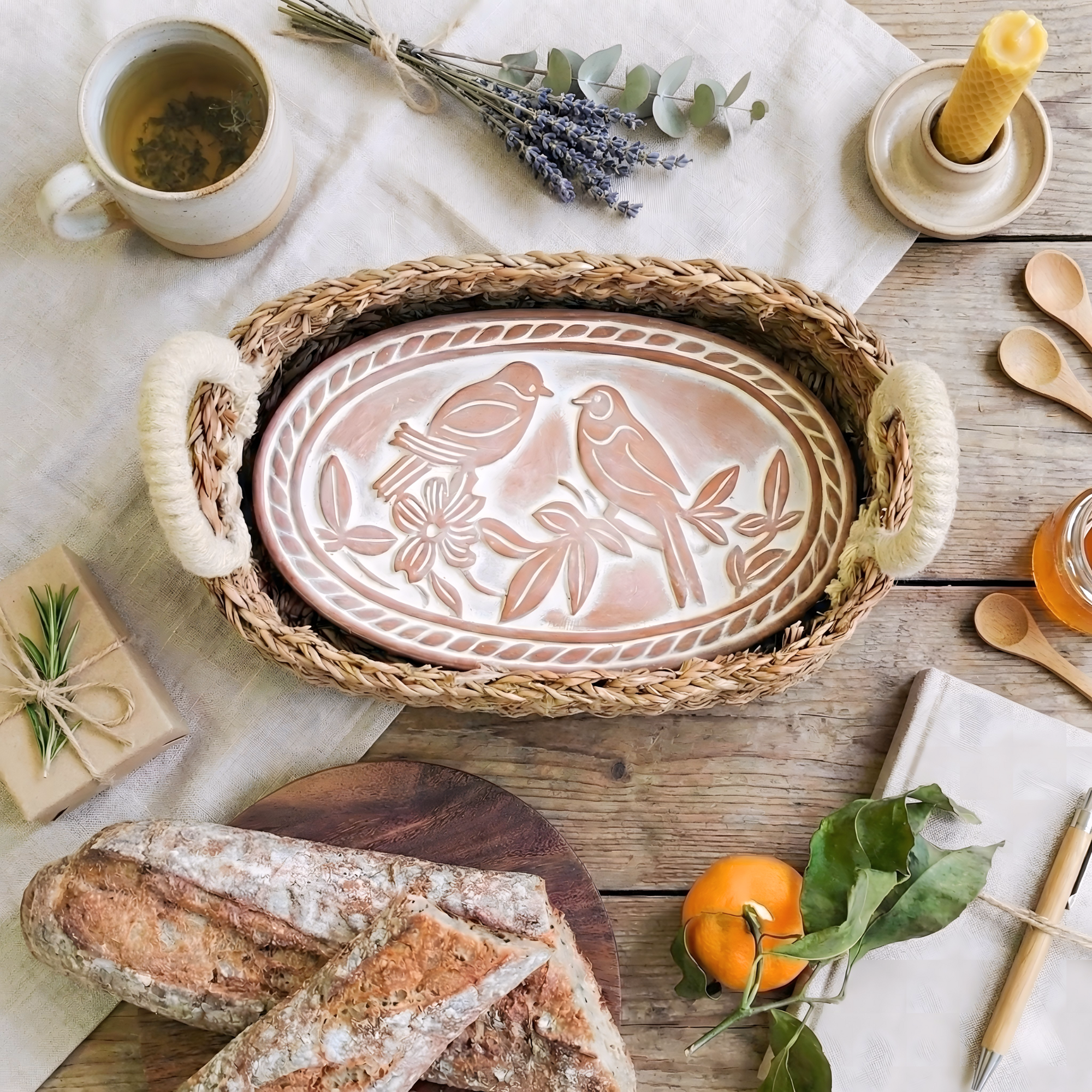 This bread warmer basket is the ideal gift for home bakers who love sharing their freshly made loaves with family and friends. Simple to use, it keeps your bread warm throughout dinner! Featuring a charming design with a whitewashed terracotta stone, this sturdy, functional basket also doubles as an attractive fall centerpiece. Perfect for keeping pies, biscuits, tortillas, pumpkin muffins, and all your favorite baked goods warm. Wonderful for year-round entertaining. Size: 3 1/2″h x 12 1/2″w x 8 1/2″d Sustainable Materials: Whitewashed terracotta stone and kaisa grass basket. Fair Trade: Women artisans receive a fair, living wage for their work. Use and Care Instructions: Rinse before first use. Dry well. Preheat oven to 350°F. Place terracotta stone in oven and bake for 10 minutes. Do not put basket in oven. Handling carefully, place stone in basket. For best results, wrap food in towel and place on warmer. To clean, rinse with water. Not dishwasher safe.