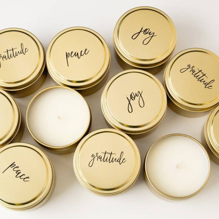 Our Year of Inspiration travel tins are a year in, year out favorite. Perfect size and price with a wonderful selection of 12 fragrances and quotes from women around the world, each in a unique color. One for every month of the year! Vessel: recyclable aluminum, 3” W x 2” H Burn time: 20 hours Fragrance: essential oil based Wax: soy blend candle with cotton wick