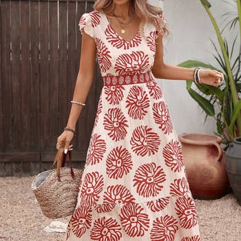Boho print short sleeve floral mid-length dress