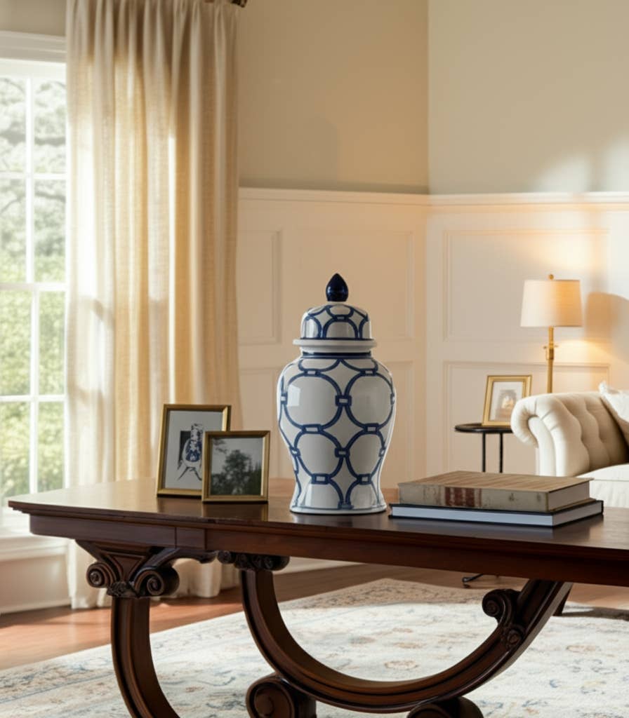 • ELEGANT DECORATIVE ACCENT - Add sophistication to any space with this blue ceramic stoneware jar. The intricate diamond pattern and gold accents make it a timeless centerpiece for living rooms, kitchens, or entryways. • DURABLE HIGH-QUALITY STONEWARE - Crafted from premium ceramic, this decorative jar offers long-lasting durability. Resistant to chipping and fading, it ensures your decor stays stylish for years to come. • VERSATILE STORAGE & DISPLAY - Use it as a stylish storage container or remove the lid to display flowers and greenery. Perfect as a decorative vase, mantelpiece accent, or elegant bookcase addition. • REMOVABLE LID FOR CONVENIENCE - Designed with a secure yet easily removable lid, this stoneware jar allows both functional storage and open display.