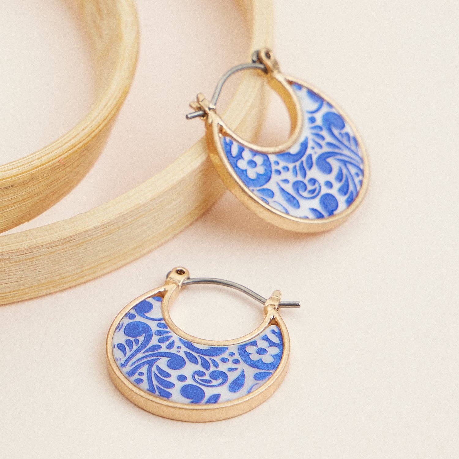 Blue Ceramic Porcelain Hoop Earrings offer a unique twist on the classic hoop design. The vibrant blue ceramic porcelain toile pattern adds a touch of color, while the smooth finish provides a sleek and modern look. Lightweight and stylish hoop. Designed for both style and durability, the titanium stud is perfect for sensitive ears, while the lightweight design. Product details: length: 1.25" width: 1.25" earring back: Titanium Post metal finish: gold Plating product: Lead & Nickel Compliant anti-tarnish: Double E-coating The titanium posts ensure durability and hypoallergenic wear, making them suitable for sensitive ears. Hypoallergenic post Surgical steel post Lightweight post Durable post