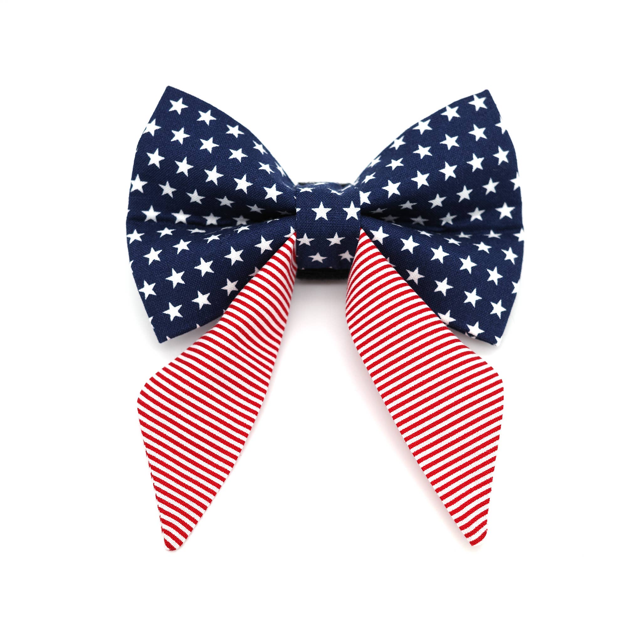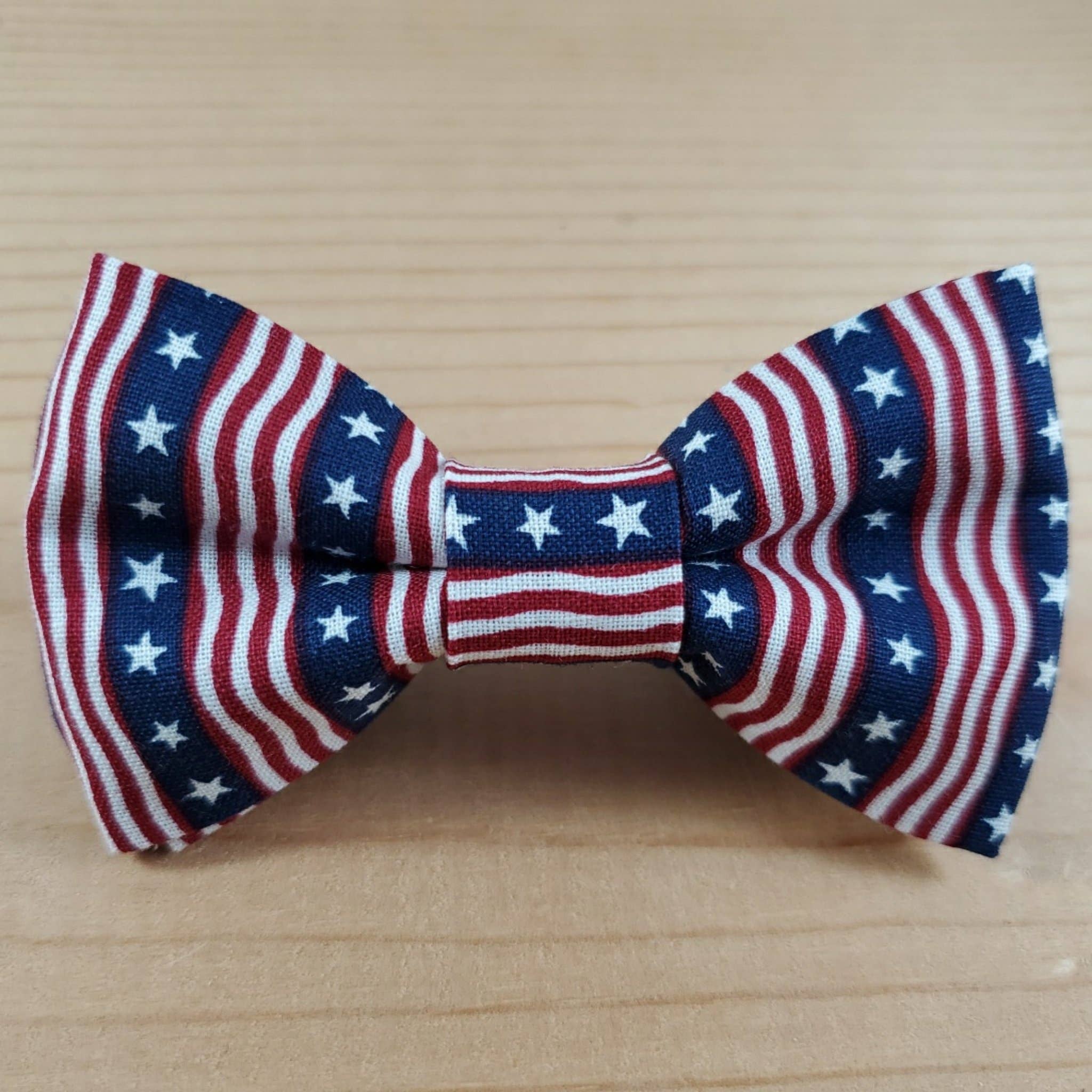 The "Proud to be an American" bow tie. Show off your pup’s pride in this American flag designed bow tie. PAWfect for Memorial Day, July 4th, Veteran's day, or a summer BBQ cook out or picnic! Details Bow ties are double layered and made with premium cotton for a sturdier and dapper look, especially during playtime! 4" Double sided (hook-and-loop) velcro to attach to your pups collar. *Please note that each bow tie is individually made from a custom fabric. Your pups bow tie will have the same pattern as the one pictured, but will vary slightly from the photos. Made in the USA. Sizing Chart Sizes: (W x L) * Small: 3.5" x 2.5” * Medium: 4.25”x 2.5” * Large: 5" x 3" * X-Large: 6" x 4" Bow ties are handmade so there may be slight variation in sizing. Care Instructions Spot clean only.