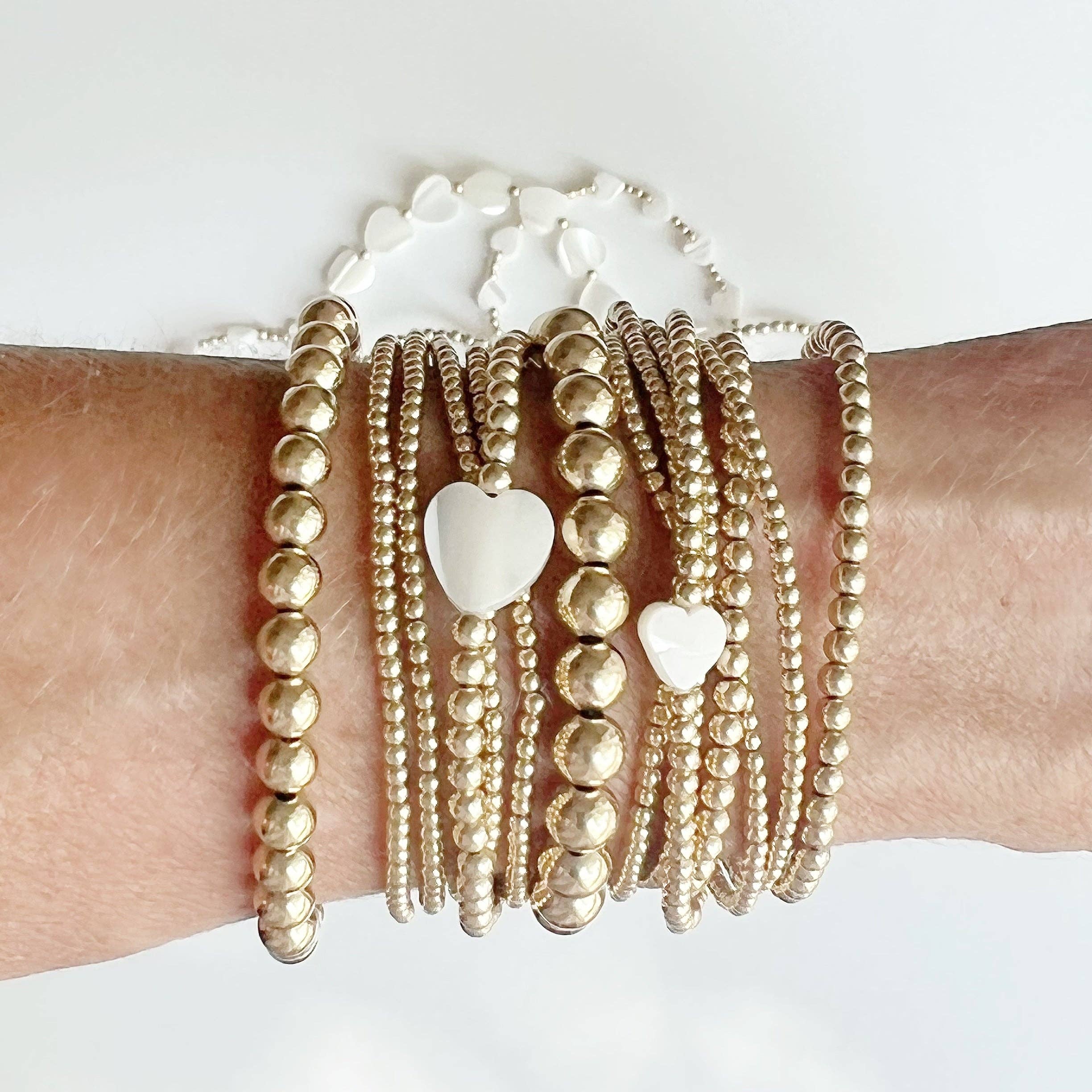 * Small, pink dyed mother of pearl hearts on 14k gold filled beaded, stretchy bracelet * Non tarnishing and worry-free wear! * Fits wrist comfortable up from 6.75- 7"