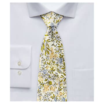 Handmade floral neckties with a vibrant, lush yellow flower pattern that is sure to add a touch of style and sophistication to any suit. Each tie is carefully hand stitched. *The lapel pins and pocket squares are sold separately.* Every item is individually packaged. Check out the last image to see what the packaging looks like. This item was made by hand in a smoke-free, pet-free home. Please message me if you have any questions. Made with 100% cotton. ⌇APPROXIMATE MEASUREMENTS⌇ Narrowest point • 1 1/2 in. Widest point • 3 1/8 in. Total length • 57 3/8 in.