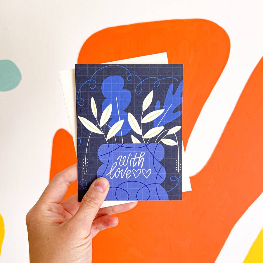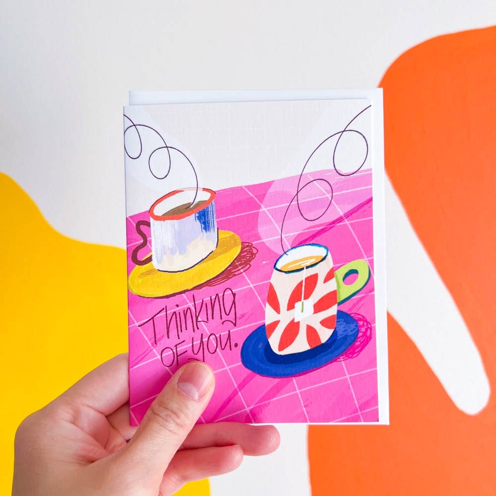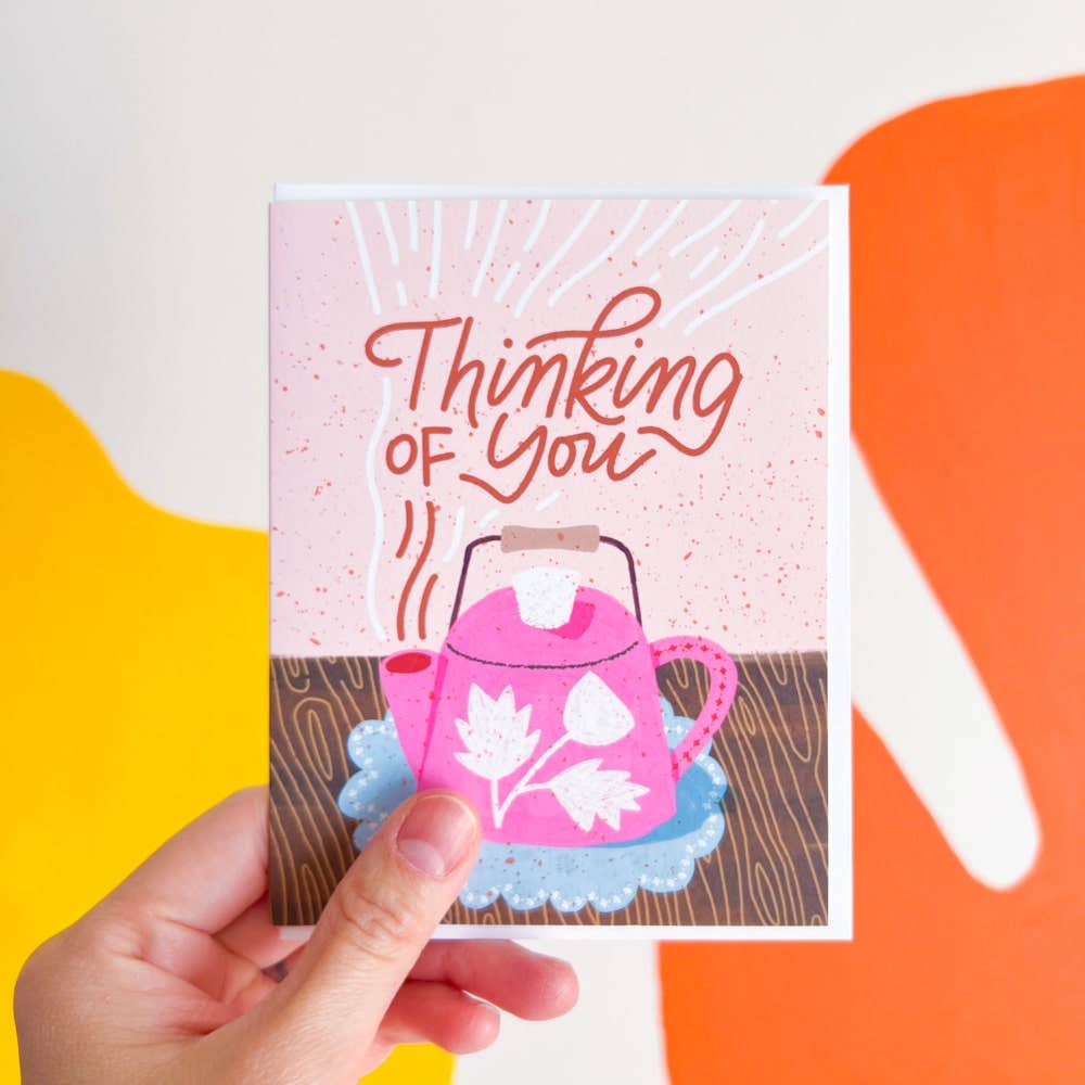A sweet hand-illustrated card featuring a fluffy orange cat with arms wide open, ready to deliver a big squeeze. Hand-lettered “Sending You a Hug” on a speckled cream background with a soft lavender border and playful scalloped frame. Perfect for encouragement, sympathy, missing you, or just because someone needs a little extra love. • Blank inside • Printed on #120 Eggshell Heavyweight paper • Size: Folded 4.25 x 5.5 inches (A2) • A matching envelope is included • Individually wrapped with resealable bags • Illustrated and Printed in the US © Esther Nariyoshi, LLC