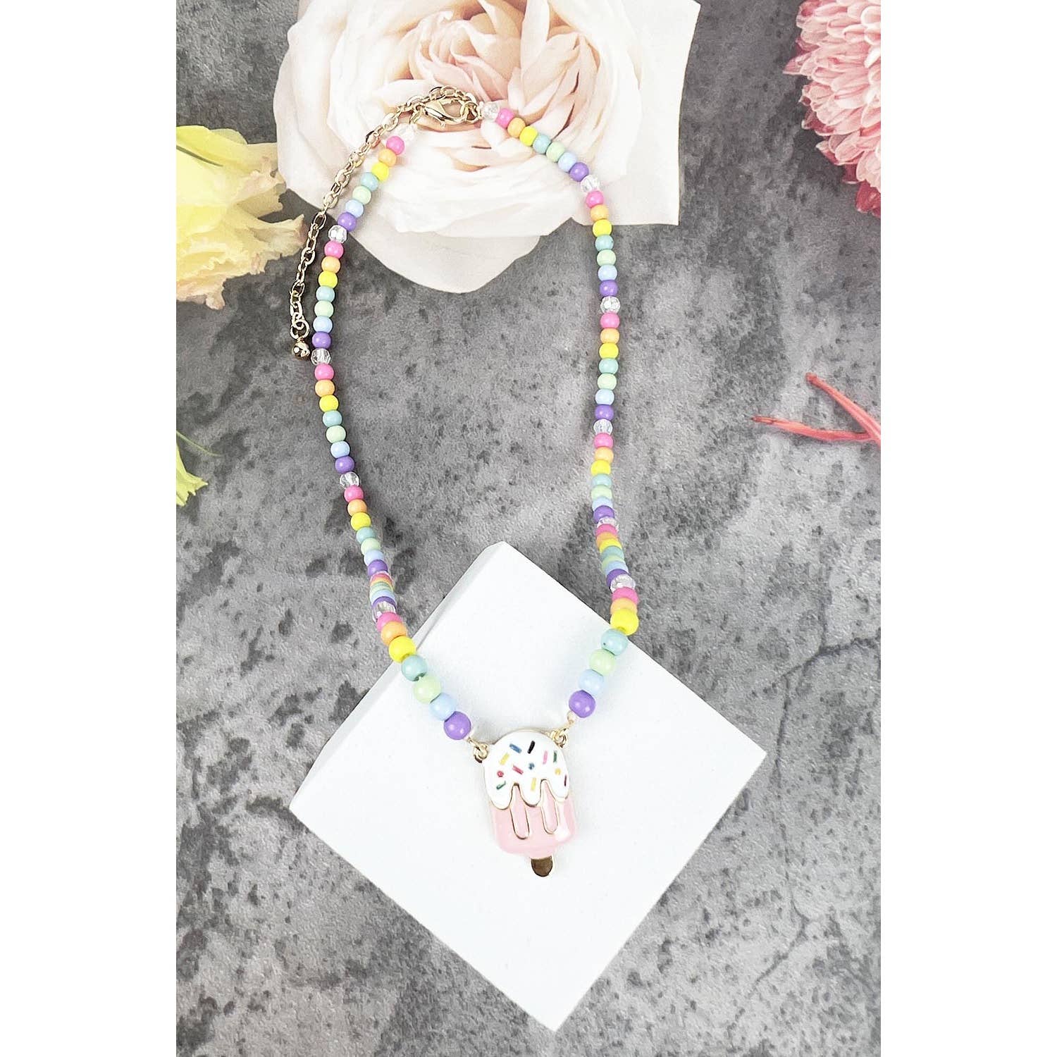 Colorful Chunky Beaded Necklace with hanging flower. So cute for spring, summer, Easter and more. Matches so many outfits with it's different colorful beads