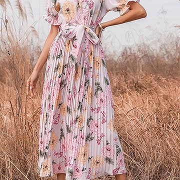 Printed midi dress with short flutter sleeve and ruffle neck. Also available in sizes S to L: Style no. ID17537. Total Length: 53 1/2" Content: 85% Rayon, 15% Nylon