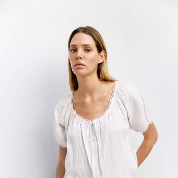 Woven Cotton Gauze Plunged V-Neck Button Short Sleeve Top