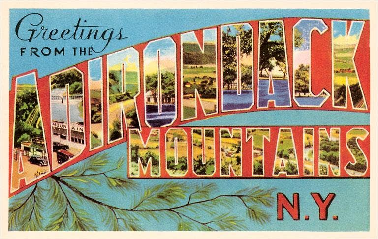 Size 4-5/8" x 3-3/8" Image Description: a dark green map motif sticker with the white text Adirondack Park across it, little white text in spots say "NEW YORK" "LAKE GEORGE" "LAKE CHAMPLAIN" "MOOSE RIVER" "GREAT SACANDAGA LAKE", along with little white motifs of trees, mountains and animals All images, products and designs © Noteworthy Paper & Press