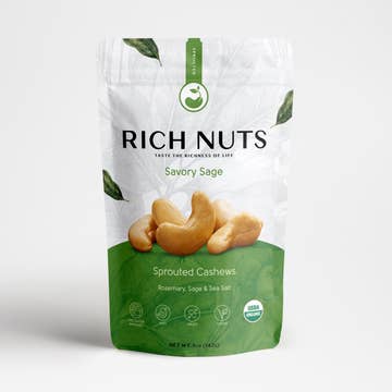Sprouted Cashews Organic rosemary, sage, and sea salt give these cashews a rich, umami flavor. We start with raw cashews from triple-certified organic farms in Vietnam and SMETA Ethical Trade Audit certified facilities. These world-class cashews are preservative-free, pesticide-free, vegan, gluten-free, and Paleo diet approved. We spark their germination with pure water to unlock nutrients. Then gently dehydrate them to preserve all that vital goodness and give them a superior crunch. Clean, simple, healthy, and totally crave-able! Ingredients * Rich Nuts Artisanal-Sprouted Organic Cashews * Coconut Aminos * Organic Rosemary * Organic Sage * Sea Salt