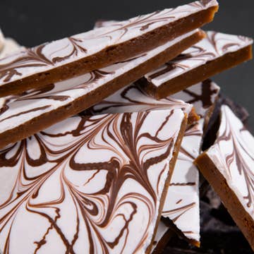 This delightful confection is our take on the popular layered cocktail. Stolichnaya® Vodka from Latvia and Kahlua® coffee-rum liqueur in a delightfully smooth traditional brown sugar English Toffee layer, covered in silky smooth couverture-grade Belgian white (28%) chocolate with a thin ribbon of couverture milk (33.6%) chocolate. __ Understanding "English Toffee" vs American "Toffee" English Toffee dates to the early 1800's and consists of brown sugar and butter in a caramelized form. American Toffee is generally harder, as it's made with granulated white sugar (e.g. Almond Roca®, Heath Bar®) usually cooked with nuts and rolled in chocolate. This is actually what the Brits would call "Buttercrunch"...introduced by English immigrant William Loft in New York City in 1860 (thus the misnomer). As such, most "toffee" available in the USA isn't traditional English Toffee. We pride ourselves on being one of the VERY few companies in America producing a true traditional English Toffee.