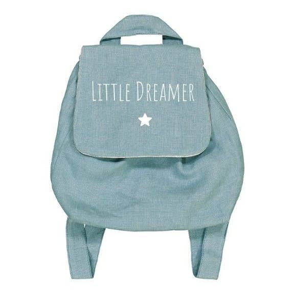 “Little Dreamer” peacock blue linen backpack with heart symbol