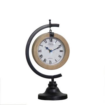 Keep track of time with this traditional tabletop clock. The arched wood structure features a warm wood front accented by a clean white border, and elevated by a glass cover over the clock face sealed with a black metal rim. At the top of the arch, you'll find a decorative metal loop as an added detail. Its natural colors allow this clock to be styled with ease, while still maintaining a timeless feel. -Easy access battery panel in back. -AA Battery Not Included. Ticking mechanism. -Material: Metal, Wood and Plexiglass. -Clean painted white border paired with natural wood grain on the front makes this item neutral and transitional. -Perfect For: Traditional Decor, Vintage Home Decor, Coastal Decor, Coastal Home Decor, Farmhouse Home Decor, Home Decor Modern, Gift Shop Items, Home Decor Accents