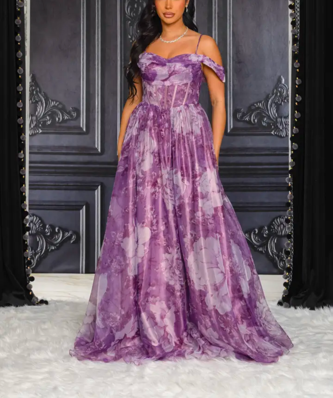 Floral print organza maxi dress with adjustable straps, full lining, sweetheart neckline, corset waist, no slit, and back zipper. Dress does not stretch.
