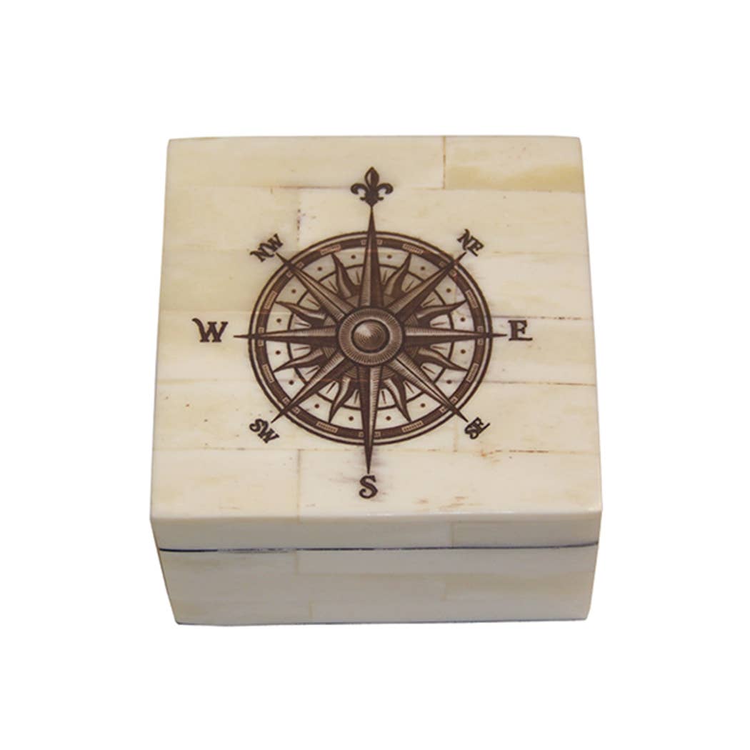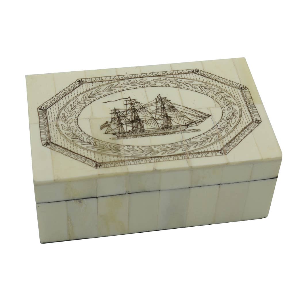 Begun by sailors working on whaling ships out of New England, scrimshaw may be the only art form that originated in America. Our scrimshaw is created by etching varying designs on genuine ox bone. Perfect for holding jewelry, keys and keepsakes. • Antique reproduction scrimshaw bone box 3-1/4" x 3-1/4" x 2" • Lift-off lid and green felt-lined interior. • Natural, authentic ox bone tiles inlaid on a durable wood-composite base. • Hand polished to enhance the coloring and striations of the ox bone. • Slight ox bone color variations enhance the beauty and individuality of each box so that no two bone boxes are alike. • Sealed with bone powder and epoxy, lacquer-coated and hand-polished. Etched in USA.