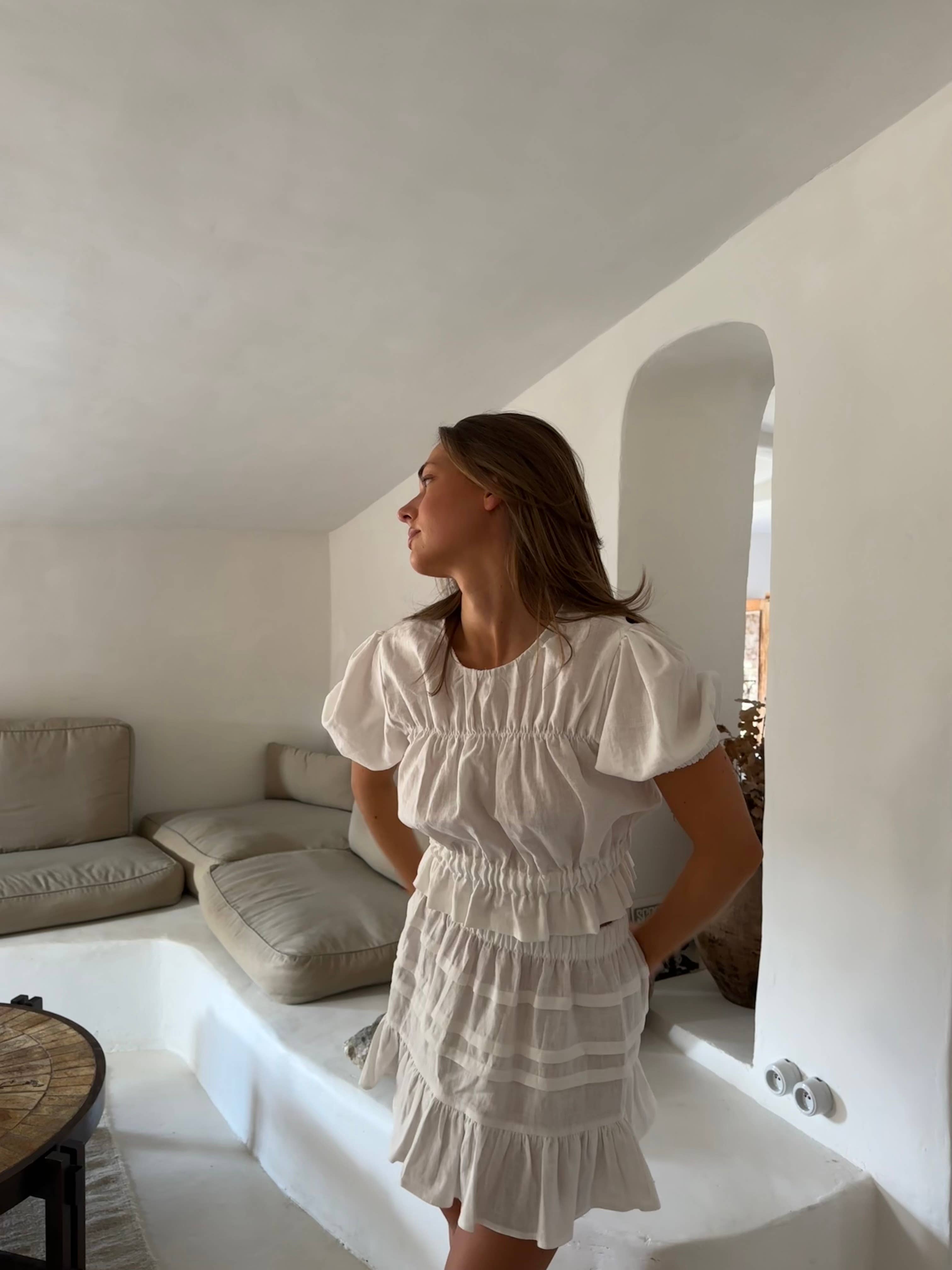 The Freya Dress is our version of a unique sundress, designed to enhance the natural silhouette. Featuring a fitted bodice it accentuates the figure while the voluminous sleeves add a touch of elegance. Perfect for effortless summer style. Fabric: * 100% organic cotton. * Lightweight and breathable, perfect for year-round wear. Care Instructions: A good quality linen lasts a long time, but in order to ensure they will last for their maximum lifetime it is best to hand wash or machine wash on a low temperature (cold or lukewarm) with a mild detergent. A mild detergent would typically mean any detergent that is scent-dye free, a detergent designed for baby clothes, or a specific linen detergent. If the piece is from cotton we advise to hand wash or washing machine with cold water and little soap. Do not use the tumble dryer. We recommend to not leave the piece wet because otherwise it can stretch or get a different shape."