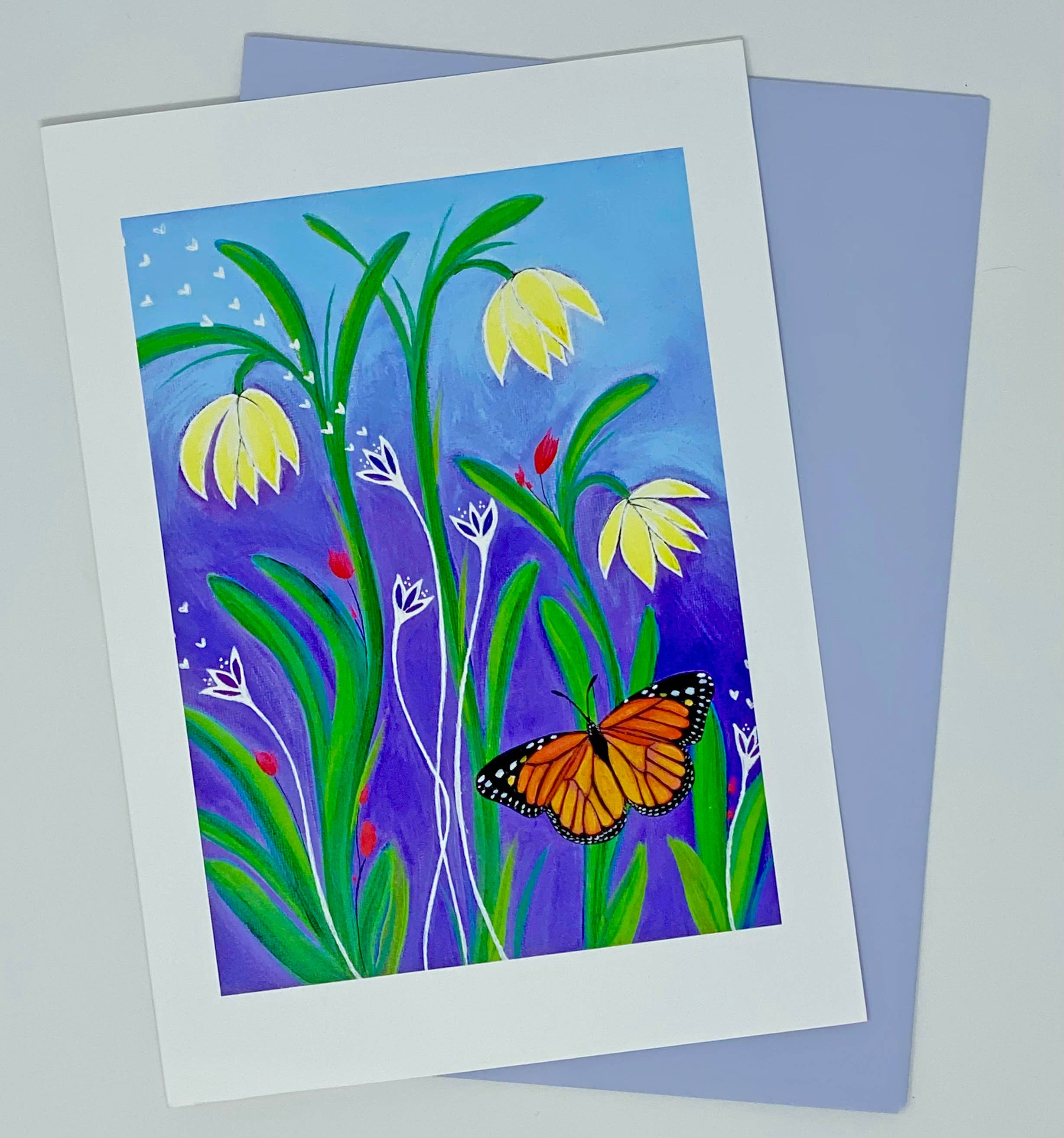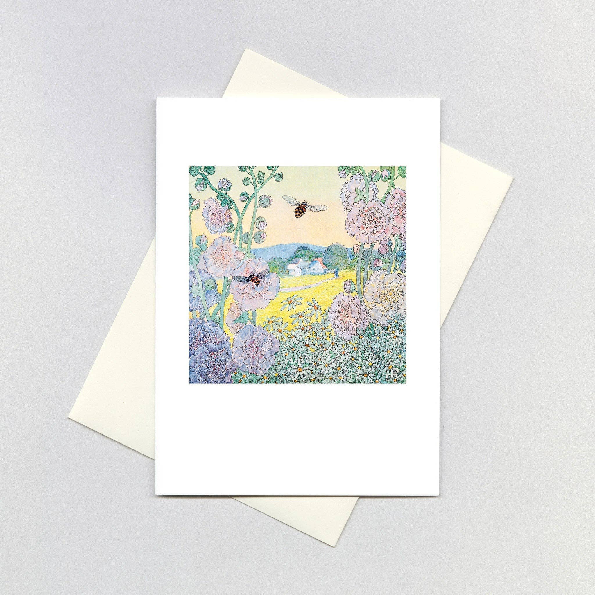 Everyday greeting card featuring a mountain scene with wildflowers in the foreground. This is a print from an original hand-tinted paper collage artwork. The original art has been scanned and then printed onto archival paper. Cards are blank inside to add a personal message. Each card comes with a white envelope and is wrapped in a clear sleeve.