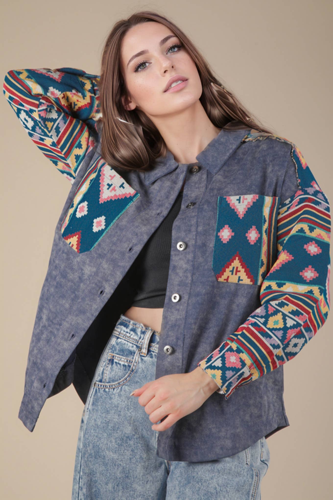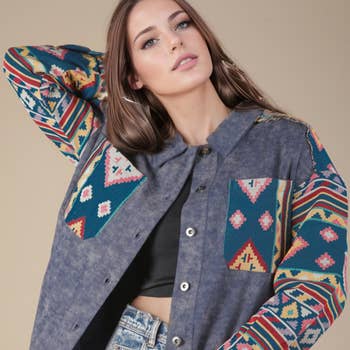 Western Aztec pattern jacket button down, side packets open front,