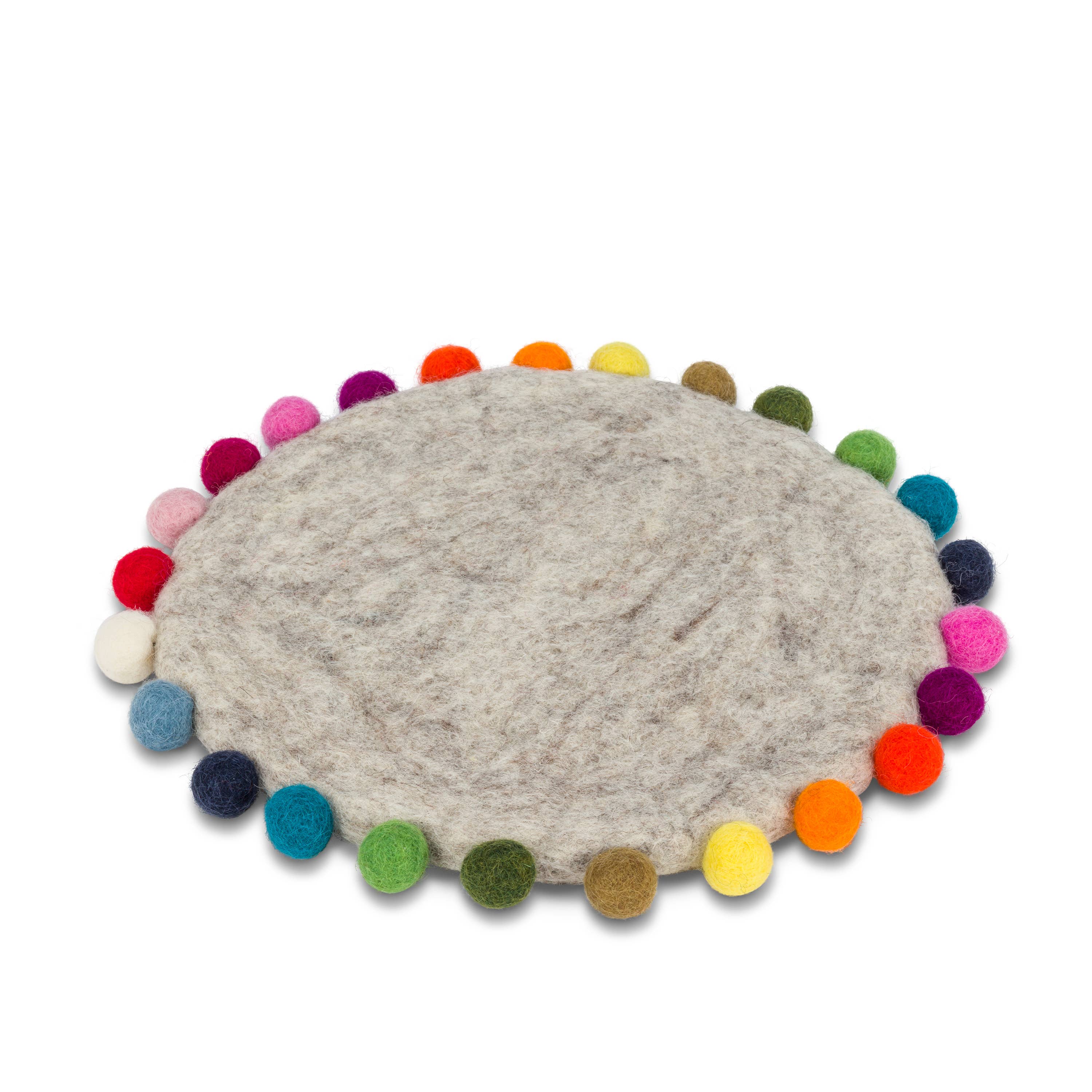 Ombre colors create a kaleidoscope pattern on these cozy woolen trivets. Each sphere is hand-felted and connected creating an unusual, textural statement for the kitchen or table. Size: w6 x l6in Material content: 90% recycled wool felt / 10% recycled polyester Care instructions: spot clean only