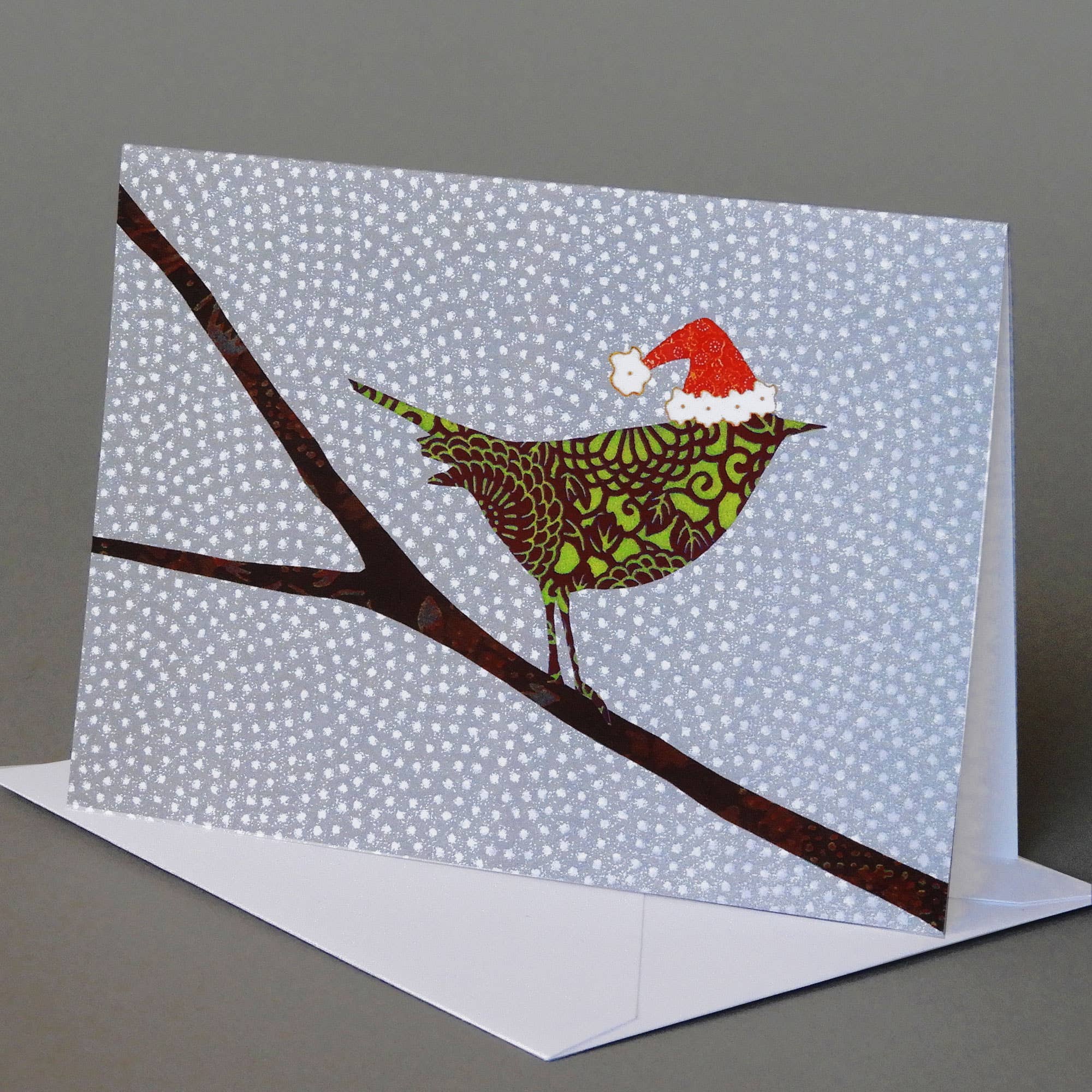Blank notecard, A1 size: 3 1/2" x 4 7/8". This image is a reproduction of an original design made using Japanese origami paper, and is commercially printed in Vermont on heavy weight 100# bright white cardstock that is a pleasure to write on. The cards and envelopes are from FSC certified sources, and come packaged in a clear compostable protective sleeve.