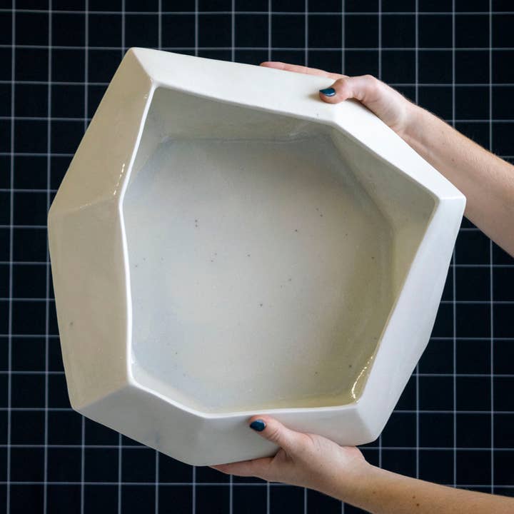 Elevate Your Plant Game This stunning geometric planter brings modern style to your favorite houseplants. Designed to conceal standard plastic pots for hassle-free upgrading! Not frost-proof - bring inside when the temperature drops! Dimensions: 11x11x9.25”