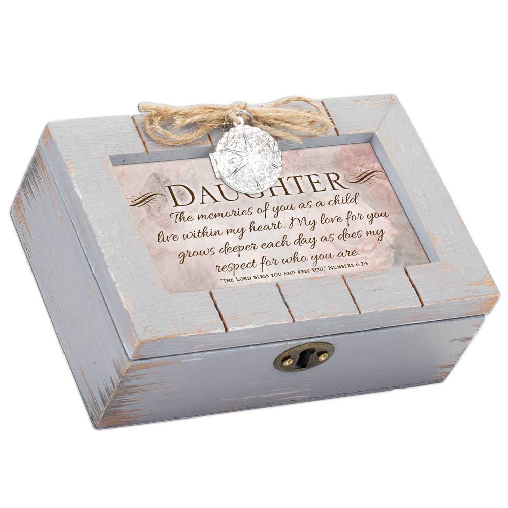 Blessed is she who believed that the Lord would fulfill His promises to her. Luke 1:45. Musical keepsake box is covered in soft charcoal grey mirror glass to create a look of stately elegance. The crowning touch is a circle of clear sparkling stones on the photo frame lid. Inside the round window, under glass, is a calligraphy art print with sentiment. It can easily be replaced by a photo trimmed to about 2 7/8in square. Window size at top is 2 5/8in diameter. Inside box is a smaller compartment that contains the high quality Sankyo musical movement. When key is wound, music will play when lid is open and stop when it is closed. Plays the song: How Great Thou Art. The storage compartment has a luxurious black velvety lining. Pads on bottom of box protect your furniture. Overall box size is about 5 x 5 x 2 3/4.
