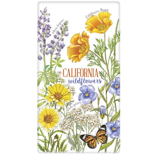 Celebrate the Golden State with this bright, high quality flour sack tea towel featuring an arrangement of cheerful California wildflowers in a vintage-inspired mason jar. This whimsical, illustrated tea towel adds a pop of color to your kitchen, and makes a great gift or gift-wrap alternative for any occasion! • 27 x 27 inches • Artwork dimensions: 8.5 x 9 inches • 100% cotton • Direct-to-Garment printed • Features corner loop for easy hanging • Washer and dryer safe • Sewn and printed in California • Comes folded with a branded hang tag attached to corner loop