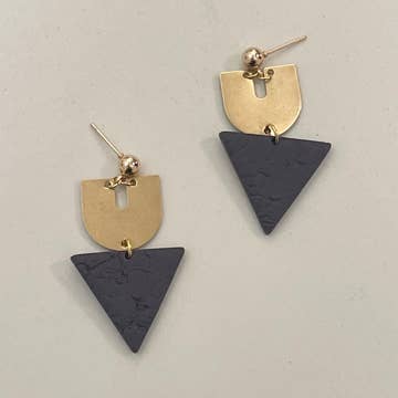 This painted wall in Antoni Gaudí’s house, Casa Milà, inspired the “ribbon” earrings and studs in this line. The shadows are painted so realistically that it actually looks like the wall has a 3D structure. A black stain is mixed into the clay to create a charcoal color.  The edges are glazed and painted with a kiln-fired 22k gold luster.  The difference in the glazed and unglazed surfaces creates a beautiful contrast. The ear hooks are 14k gold-filled.  Remnant Studios jewelry is handcrafted one piece at a time in Austin, Texas.