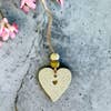 This heart ornament was handmade from clay, beach sand and wood beads. The mini heart in the center was painted with gold acrylic paint. Details: * Handmade from clay, beach sand and wood beads. Mini heart in center of ornament is painted. * Heart measures 1.5 inches Each ornament will come on a business card. These decorations are exceptionally lightweight and will not drag the branches of a tree downwards. Due to the handmade nature, the placement of the pattern may vary.